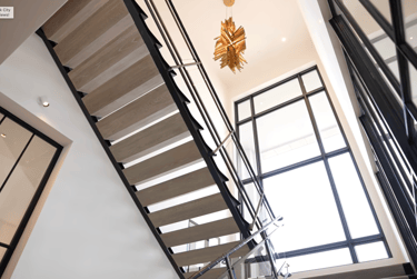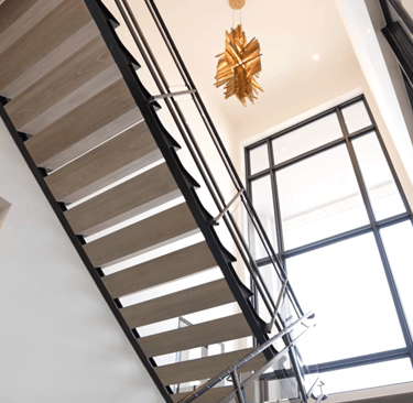 From an interior design and architectural standpoint, the spatial flow of this meticulously remodeled residence is nothing short of brilliant. The home welcomes you with an entry gallery grounded by seamless terrazzo floors and rich wood-paneled walls . What strikes me most is the deliberate restraint in the materiality. The interior designer curated an effortless minimalist palette that relies on the inherent visual weight of natural textures rather than loud embellishments. We see this brilliantly executed in the kitchen, where a breathtaking natural stone is flawlessly book-matched across the countertops and cascading waterfall edges. The architectural envelope is further elevated by industrial-leaning focal points, like the floating steel staircase with open risers and leather-wrapped glass railings, as well as the steel-cased glass partitions that allow ambient natural light to permeate the deep floor plan.