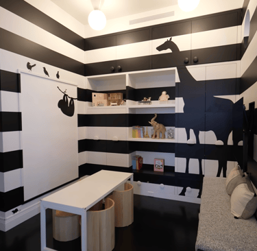 One of the most thoughtfully planned zones in the entire floor plan is the kids' wing. Rather than treating it as an afterthought, the architecture treats the children's quarters as a self-contained, experiential suite. It features a centralized, built-in hangout area with custom millwork that anchors the surrounding bedrooms. The spatial efficiency here is phenomenal—particularly the lofted bed setup that utilizes integrated storage drawers within the stair treads to maximize the vertical volume of the room. It perfectly balances a playful scale with the sophisticated design language established in the primary living areas.
